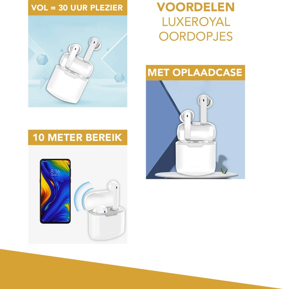 De Luxeroyal Wireless Earbuds met oplaadbare case zijn gebruiksvriendelijk en hebben een lange levensduur. Wanneer de Luxeroyal Earbuds volledig zijn opgeladen gaan ze +/-16 uur mee. Zo kunt u ze de hele dag gebruiken bij al uw activiteiten. In het doosje vindt u naast de earbuds zelf een oplaadkabel welke u via de usb-poort kunt koppelen aan een adapter. Met de case zelf, kunnen de Wireless Earbuds meerdere keren worden opgeladen.