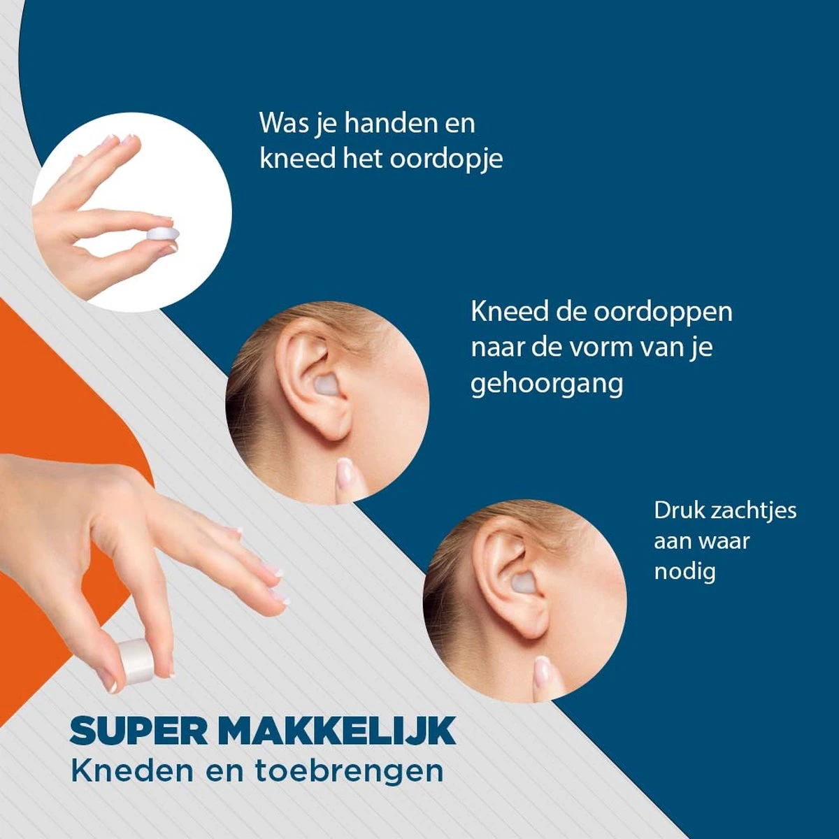 - Kneed de oordoppen in de vorm van je oor kanalen en plaats ze in je oor.